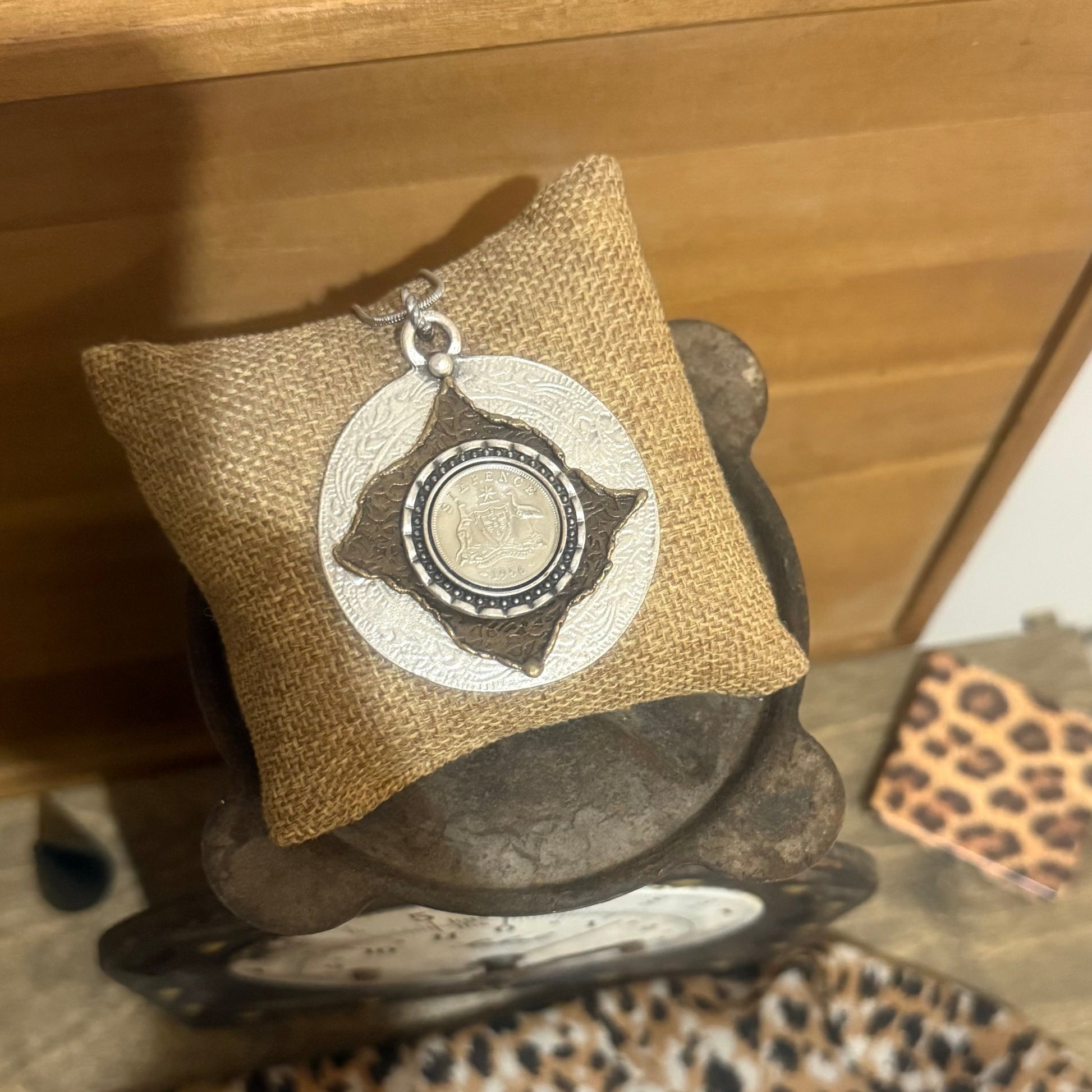 This bold, striking necklace features an authentic 1956 Australian sixpence, set within three layered decorative zamak metal surrounds, including a copper tone that adds depth and contrast. Finished on a 75cm stainless steel snake chain, this piece is statement making with a strong vintage soul.