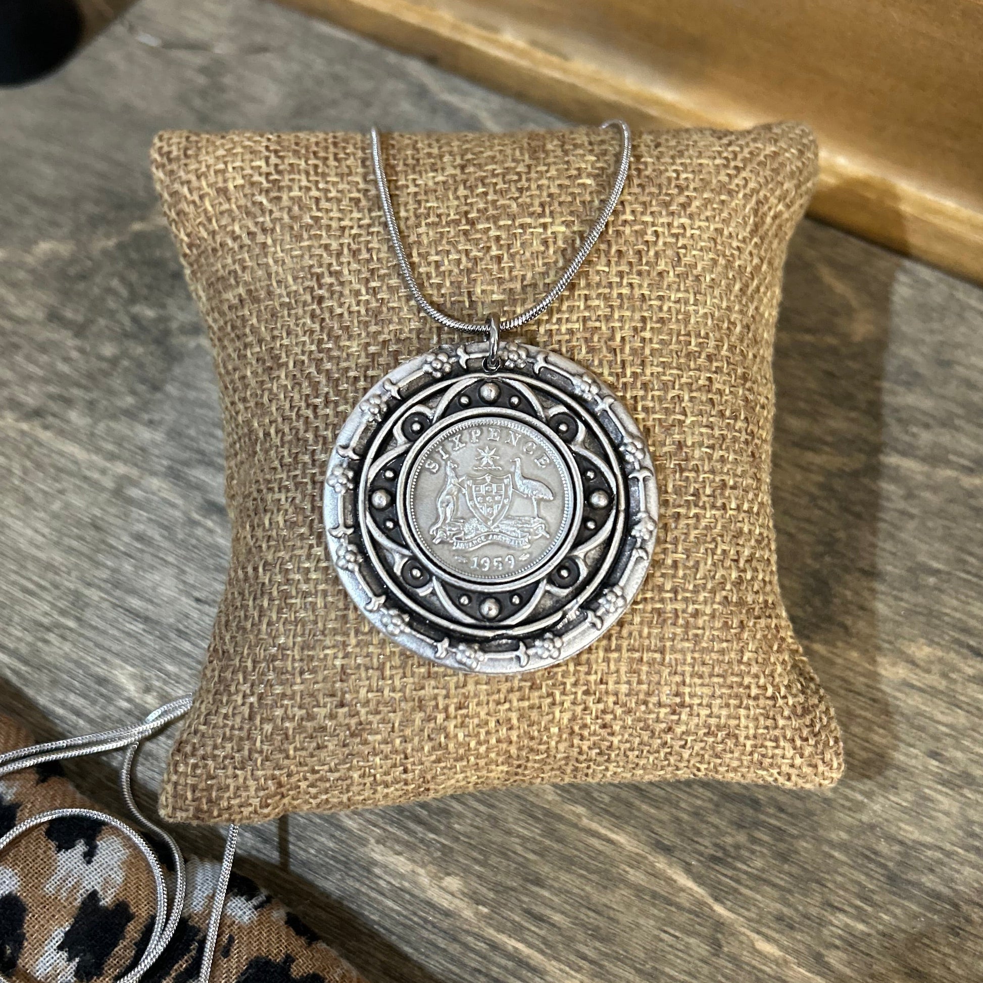 This meaningful necklace features a genuine 1959 Australian sixpence coin, beautifully framed inside a double set Zamak alloy decorative bezel. The layered surround gives depth and detail.