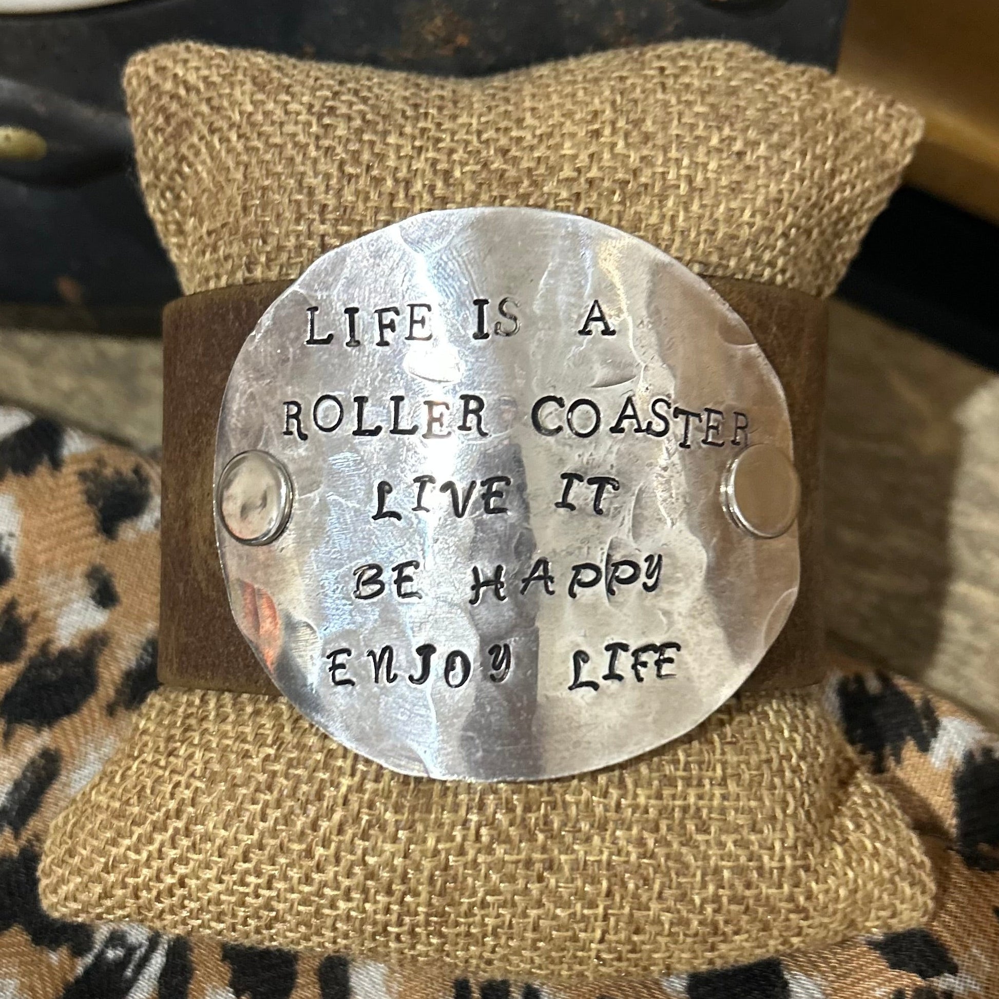 Quote hand stamped letter by letter: Life is a roller coaster, live it, be happy, enjoy life, a daily reminder to embrace the highs and lows