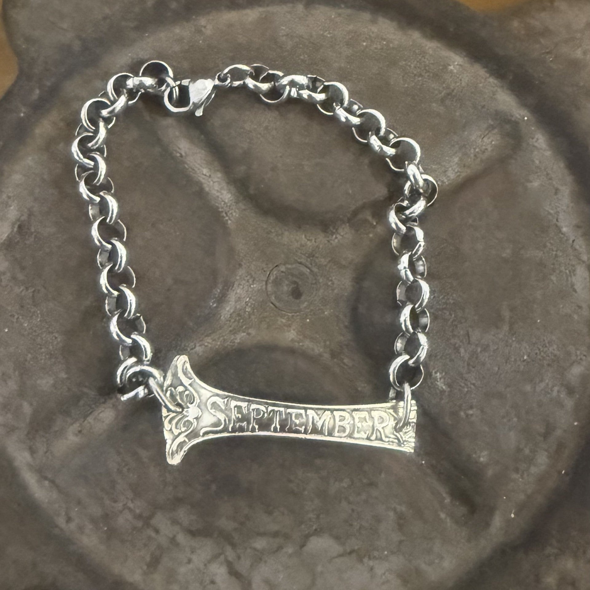 This bar bracelet has been created from a partial piece of a sterling silver Wallace spoon handle dating between 1909–1915. The original detailing remains beautifully defined, with “September” featured across the bar a nod to birth month sentiment and over a century of craftsmanship.